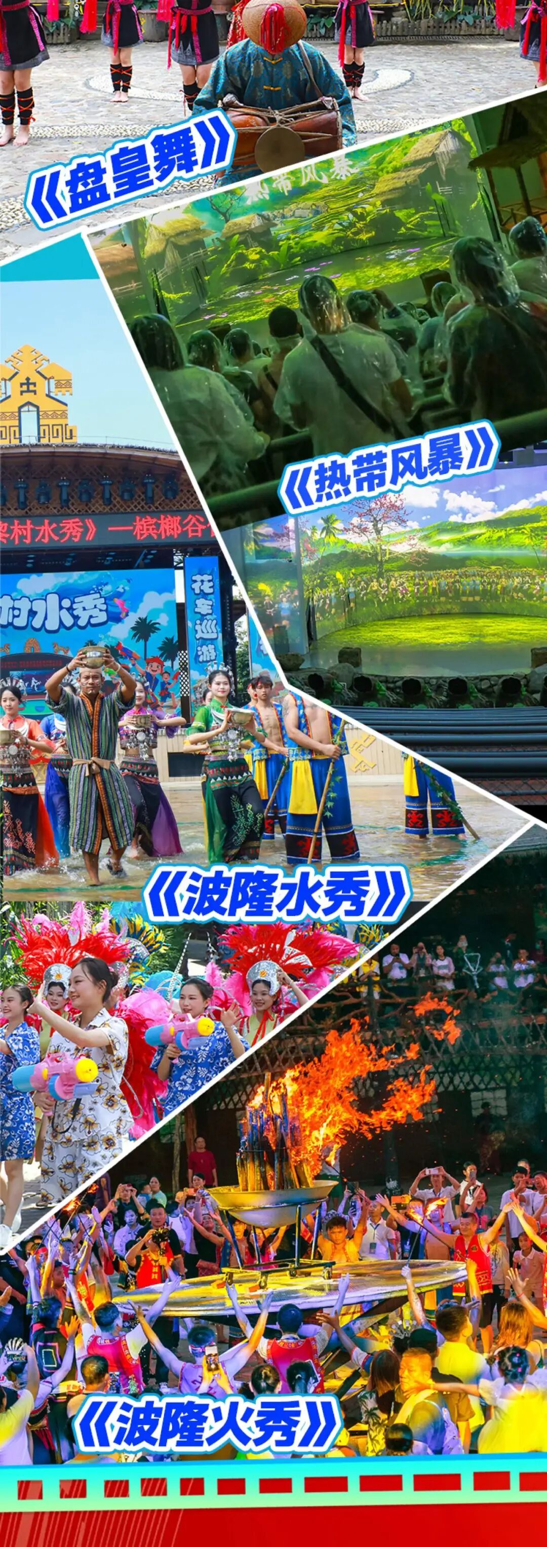 福利二:七大精彩演艺:《开寨仪式》《槟榔古韵》《刀山表演》《盘皇舞》《热带风暴》《波降水秀》《波隆火秀》