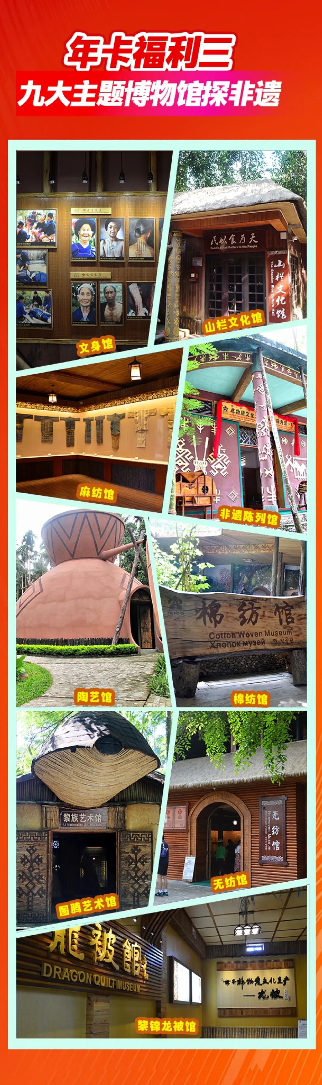 福利三:九大主题博物馆:黎锦龙被馆、无纺馆、黎族民俗馆、图腾艺术馆、麻纺馆、山栏文化馆、黎族陶艺馆、棉纺馆、文身馆