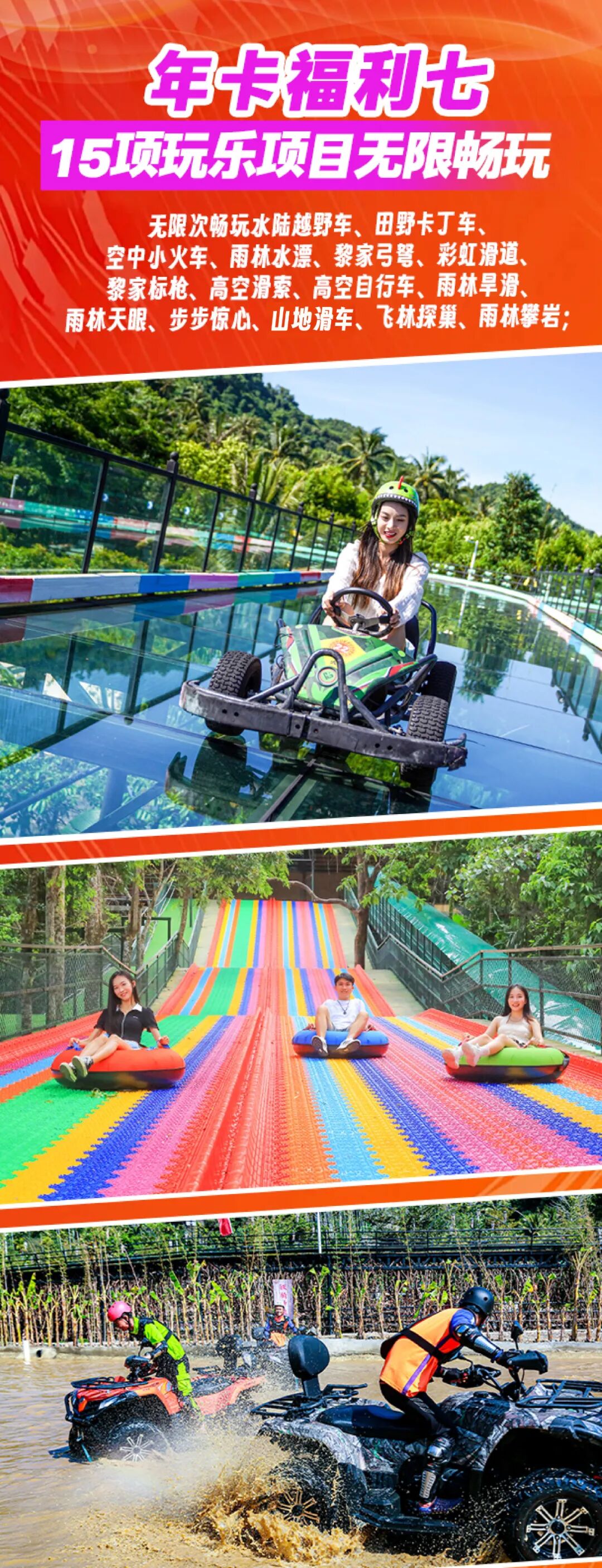 福利七:15项玩乐项目无限畅玩:水陆越野车(挑战道》、田野卡丁车、雨林攀岩,空中小火车、雨林水漂、黎家弓弩、彩虹滑道、高空自行车、黎家标枪、高空滑素、雨林旱滑、雨林天眼,步步惊心、刀山火海、飞林探巢